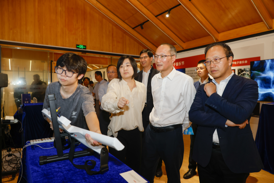 本次活动恰逢全省高校“百个艺术院系支部联村共建”工作现场推进会召开。会前,省委教育工委专职副书记、省教育厅党组副书记许翰信,中国美术学院党委书记金一斌、西湖区委常委、组织部长李军以及省教育厅组织处、各兄弟高校组织部、西湖区委组织部和转塘街道党工委负责人等领导一行,在浙音党委委员、组织部部长李俊陪同下视察数字音乐展厅。他们观看及操作每一件艺术科技展览作品,认真听取关于作品创作理念及详细介绍。许翰信对学院创新举措给予了高度肯定,他表示,这种将艺术与科技融合并带入乡村的做法,为高校艺术院系支部联村共建开辟了新路径,有助于推进乡村的现代化、科技化。