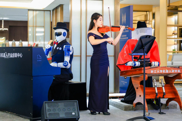 活动现场,人形机器人产业创新中心与浙江大学机器人研究院带来了两位特殊的“音乐演奏家”——“钢琴机器人”和“扬琴机器人”。它们与浙江音乐学院管弦系大三学生邓咏宁合作表演曲目,将中国传统音乐艺术和机器人技术相结合,技术层面融合了机器人技术、造型艺术、音乐艺术与机械运动等多种前沿应用。