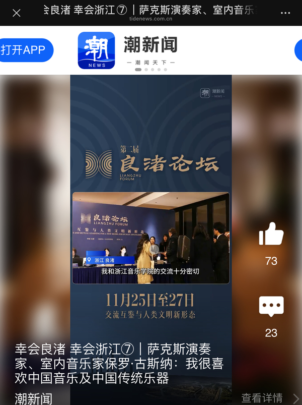 潮新闻:幸会良渚 幸会浙江⑦|萨克斯演奏家、室内音乐家保罗·古斯纳:我很喜欢中国音乐及中国传统乐器