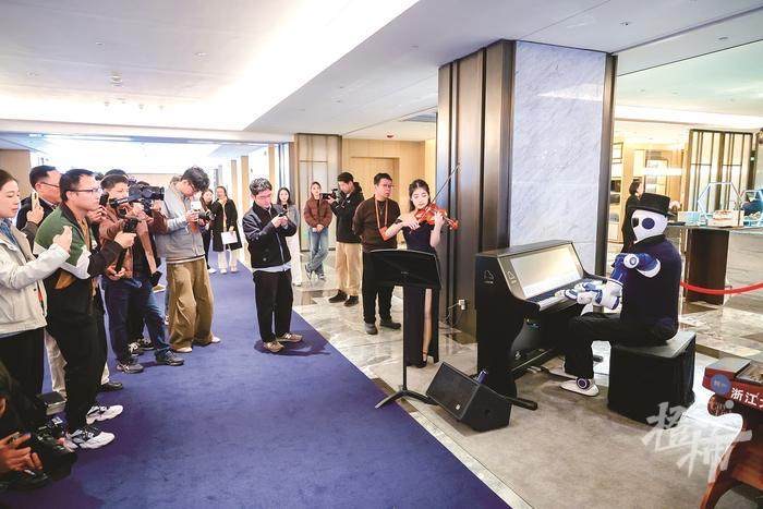 会场上,一首《梁祝》吸引了在场嘉宾的目光。这是由浙江音乐学院的小提琴手与浙江大学研发的机器人乐队携手创作,“钢琴老师”熟练的指法,让在场的嘉宾们充满了好奇心。