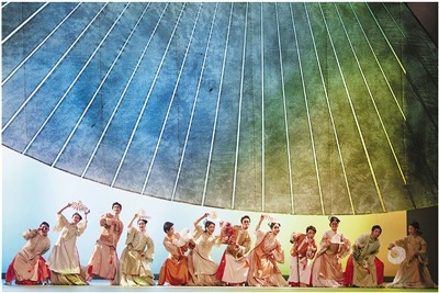 一厘一寸皆风景,一开一合话人生。无论是舞台布景还是舞蹈编排,编创团队都匠心独运,全方位融入独具江南特色的杭扇与拱桥造型,是桥与山景的结合,也是月下西湖意境;男女主人公泛舟西湖背靠背的一碰,更是让观众领略到秀丽江南自然风光背后细腻而丰富的情感传递。