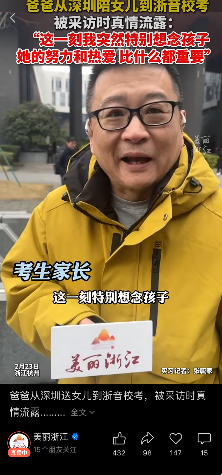 美丽浙江:爸爸从深圳送女儿到浙音校考,被采访时真情流露……