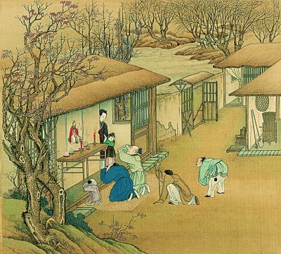 由于农耕社会的文化传统,“备办饮食,享祀先祖”的习俗是作为农业仪式而被推广的,这一点,可以通过清代御制刻版印制的《耕织图》获得确认。耕织图起源于南宋,是我国古代为劝课农桑而翔实记录耕作与蚕织的图谱,最早为画家楼璹所作,由耕图21幅、织图24幅组成。后仿绘、镂刻者众多,尤以元代程棨摹本为代表。因其“图绘以尽其状,诗歌以尽其情”的利民内容,为清代帝王所重。1689年,康熙皇帝南巡时观览到此图,感慨万端,命内廷供奉焦秉贞据其原意重新绘制耕图、织图各23幅,并将宋元耕织图中属于织图的“祀谢”绘入耕图,由此成为耕织图中“祭神”一题的标准版式。