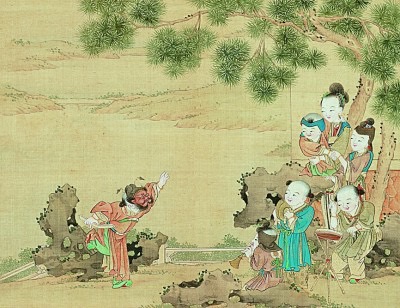 南宋词人史浩有《喜迁莺·守岁》曰:“雪消春浅。听爆竹送穷,椒花待旦,系马合簪,鸣鸦列炬,几处玳筵开宴。介我百千眉寿,齐捧玉壶金盏……守岁通宵,莫放笙歌散……待到了,道一声稳睡,明年相见。”从《庭院婴戏图》中可以看到,坐奏长笛、琵琶的仕女正与持拍板的女伴合乐,而嬉戏的孩童身后尚有抱古琴赶来的新朋,正是一幅年节场景的写生。于多彩声景中守岁作乐,是传承久远的文化习俗,更是烟火人间的太平之音。