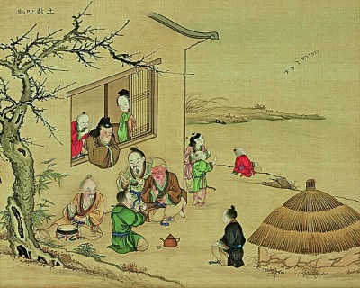 “吹豳击鼓”因祭田祖而应用于“朝看索飨万家同”的岁末。其音乐活动内容可从清代乾隆时期的《四时欢庆图》中窥见一斑。该图册画工精细典雅,人物面容祥和,显然为宫廷画家所作。从表现农家作乐场景的“击鼓吹豳”来看,画中演乐者共有四人,除了背对着画面的一人正在吹笛,另外两位老者一人敲击板鼓,一人持奏四宝,白须的长者则双掌相击以和节奏。图中人物的音乐活动表现出民间“吹豳击鼓”的时代风格。