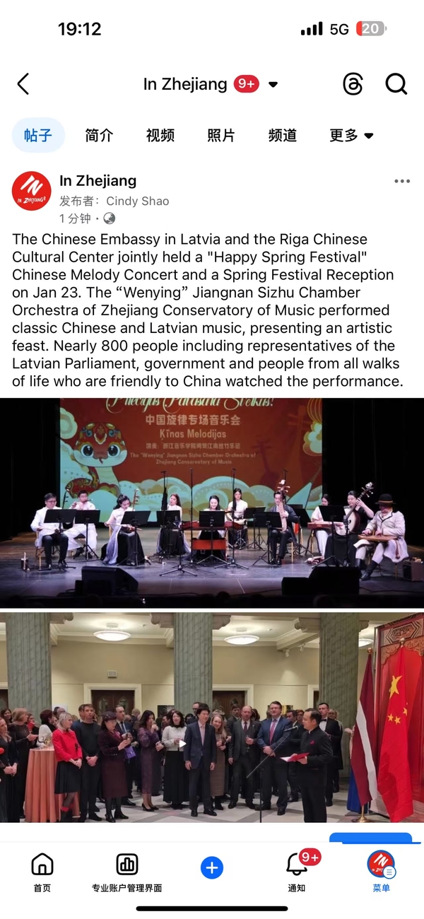 In Zhejiang:The Chinese Embassy in Latvia and the Riga Chinese Cultural Center jointly held a "Happy Spring Festival" Chinese Melody Concert and a Spring Festival Reception on Jan 23.