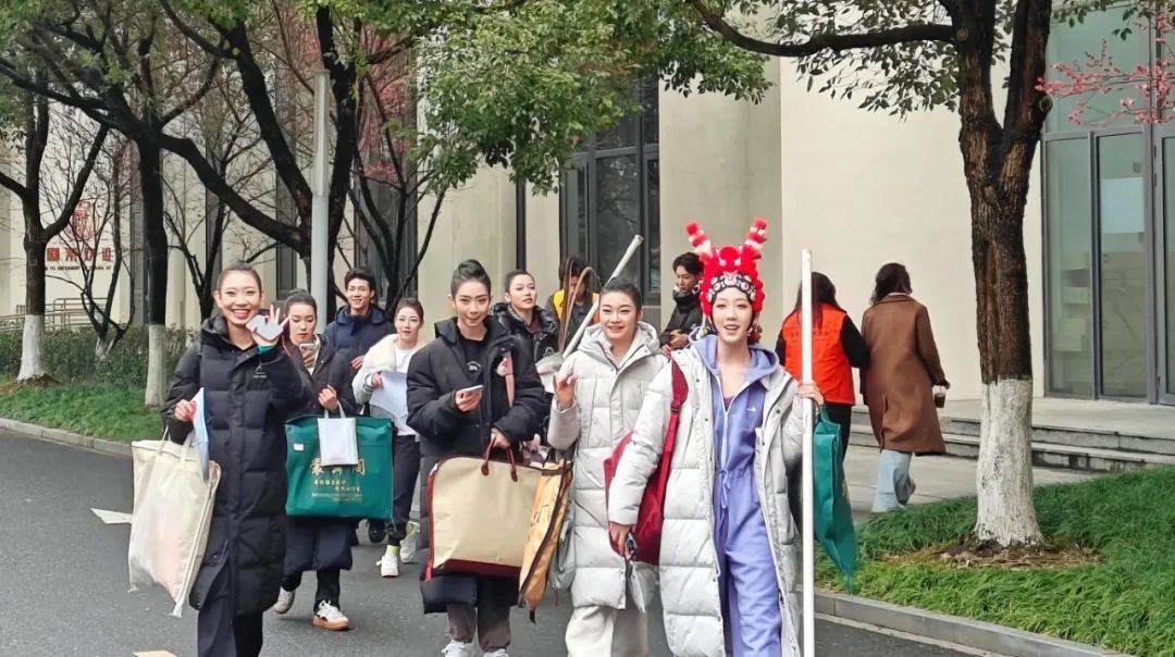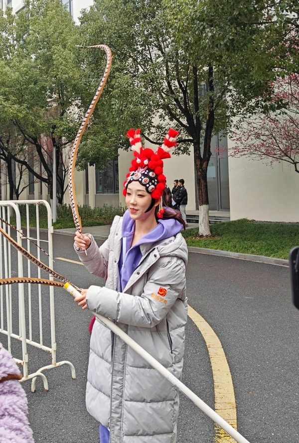 一位头戴戏曲装饰、打扮得十分华丽的同学吸引了大家的目光。她刚参加完中国舞的考试,别出心裁地将戏曲和中国舞融合在了一起。