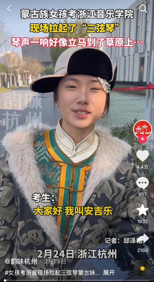 新闻来源:6.12 复制打开抖音,看看【韵味杭州的作品】# 女孩考浙音现场拉起三弦琴蒙古味十足 !# 杭州... https://v.douyin.com/i58U2cSw/ W@M.JV HVl:/ 11/04