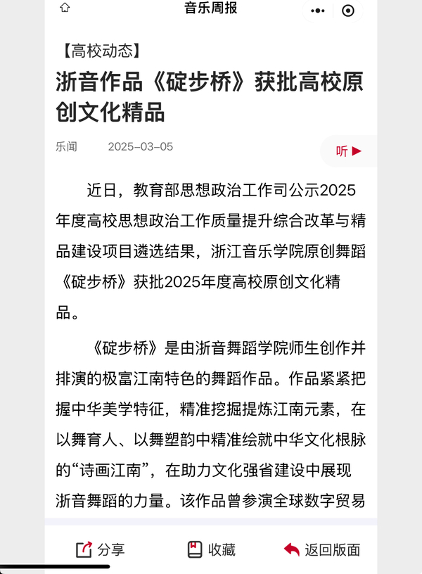 音乐周报:浙音作品《碇步桥》获批高校原创文化精品