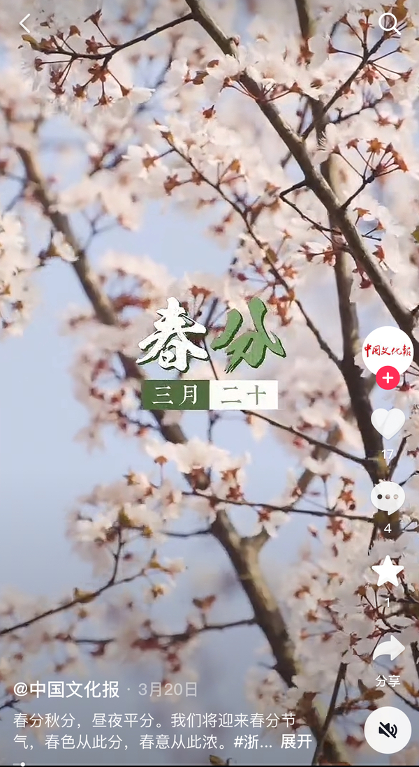 新闻来源:3.58 复制打开抖音,看看【中国文化报的作品】春分秋分,昼夜平分。我们将迎来春分节气,春色从此分... https://v.douyin.com/i5vAEm6g/ 10/09 CuF:/ a@N.Wz