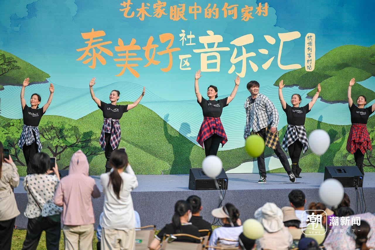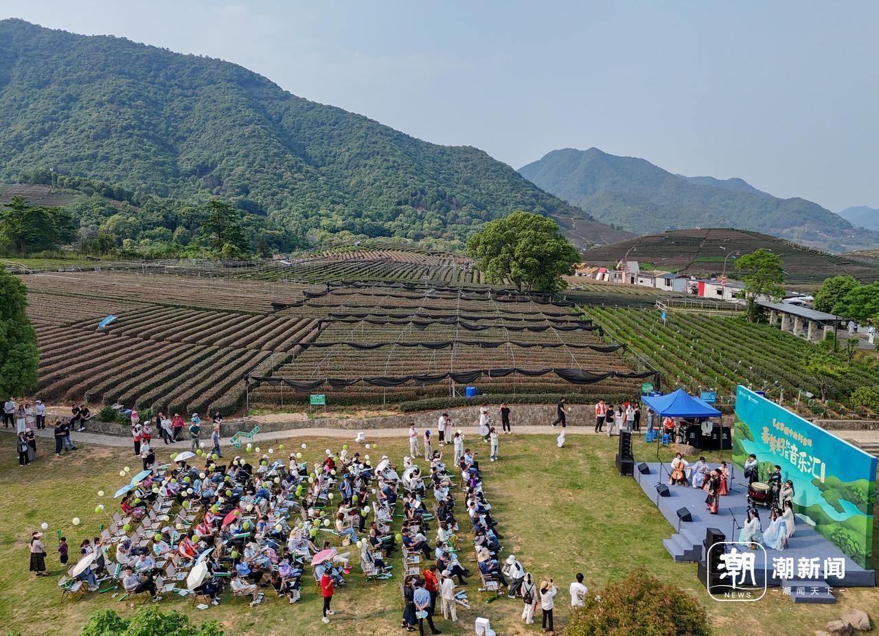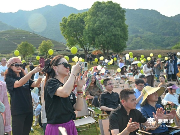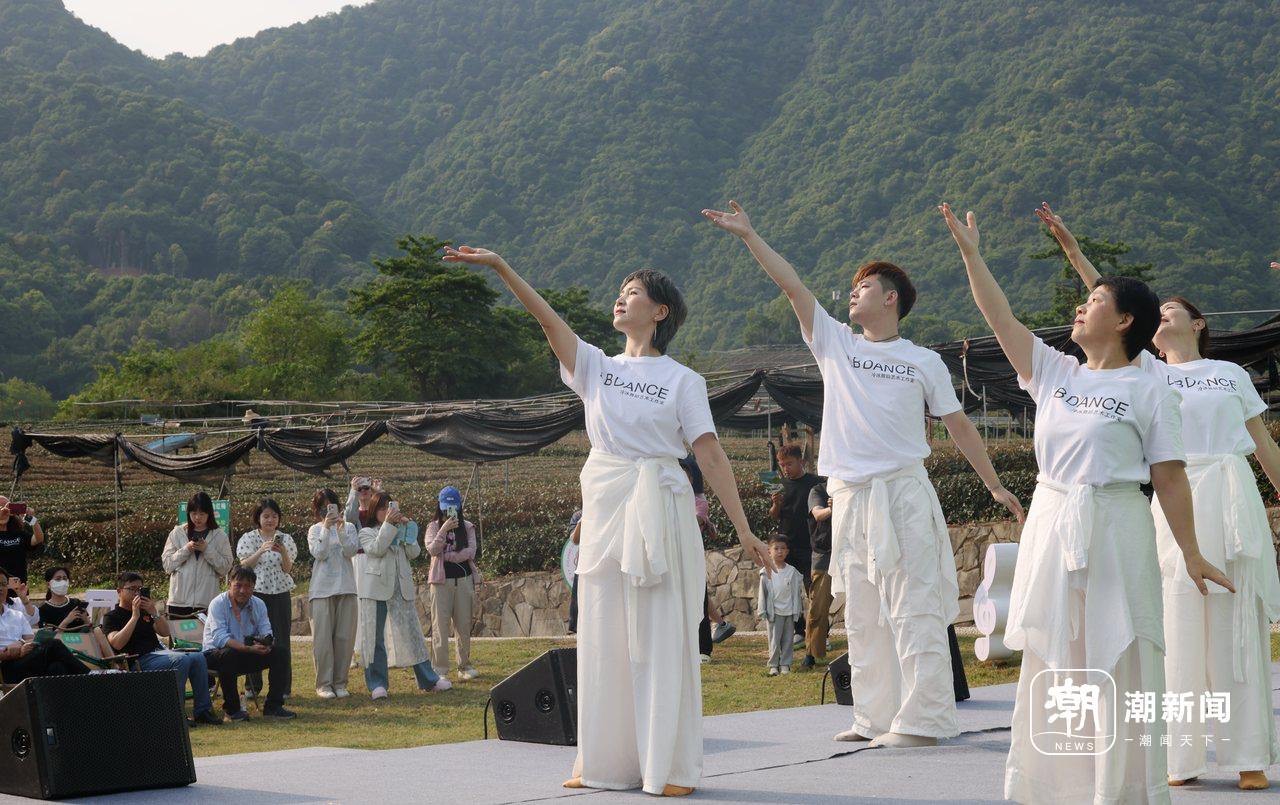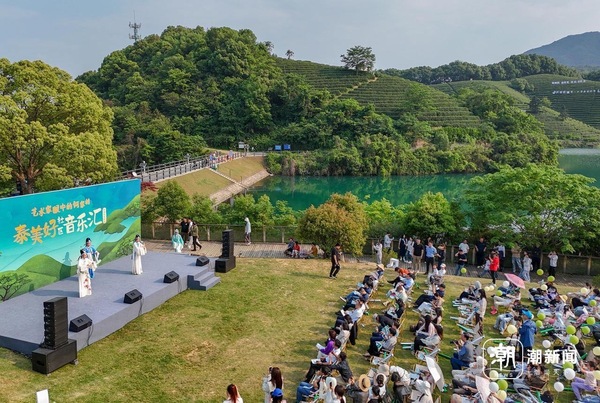 4月29日,杭州西湖区转塘街道何家村的茶园大草坪上,浙江音乐学院师生为村民和游客带来民乐、舞蹈、戏剧等精彩节目,并盛邀当地村民共同登台,在“茶田新韵”的独特旋律中真切感受艺术与自然的共鸣。