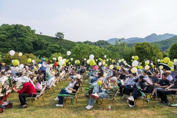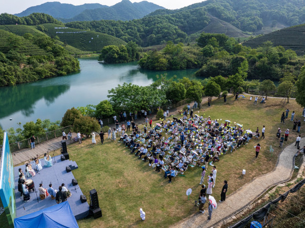 “何家村呐,美如画……”悠扬的旋律在茶山间回荡,浙江音乐学院舞蹈学院教授刘福洋带领村民在翠绿的茶山中翩然起舞。作为何家村的“艺术村长”,刘福洋与村民共同创作的村歌、村舞《舞动何家》成为活动亮点。这支舞蹈融合了田园韵律与乡村风情,舞姿舒展灵动,引得台下观众掌声连连。