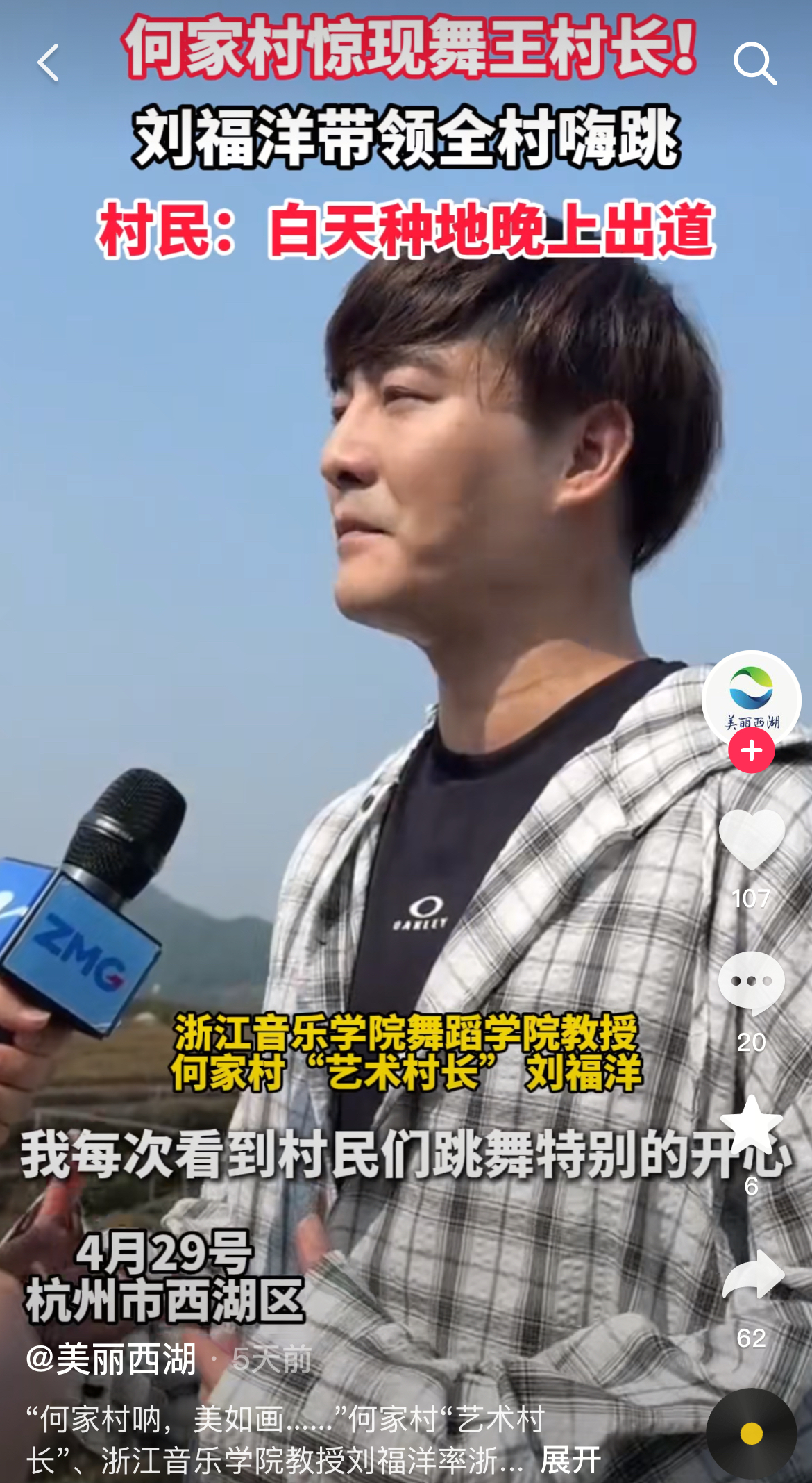 美丽西湖:“何家村呐,美如画……"何家村“艺术村长”、浙江音乐学院教授刘福洋率浙江音乐学院学生和何家村村民同台表演原创村歌、村舞《舞动何家》,带动全村热舞!