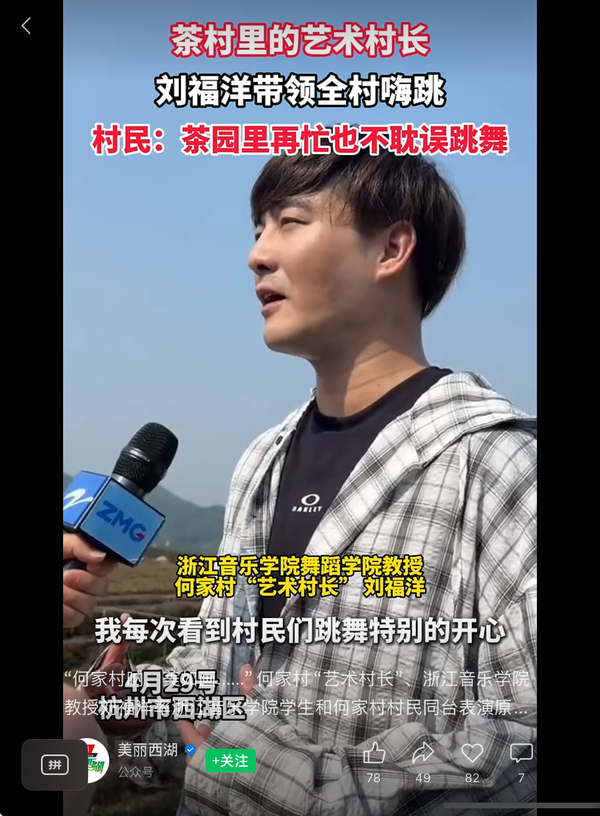 美丽西湖:“何家村呐,美如画……”何家村“艺术村长”、浙江音乐学院教授刘福洋率浙江音乐学院学生和何家村村民同台表演原创村歌、村舞《舞动何家》,带动全村热舞!