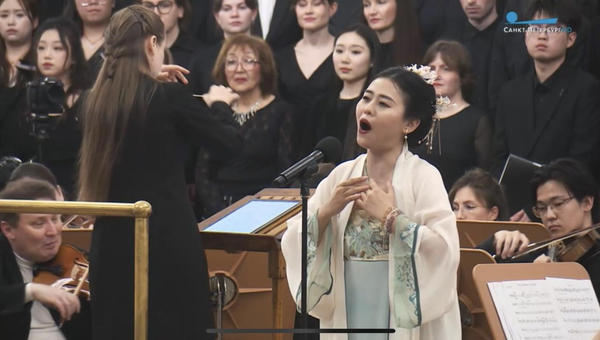 音乐会上,浙江音乐学院的李珺副教授与方香蕾老师还共同呈现了她们的新作——歌曲《余杭景》的世界首演,成为本场音乐会的亮点。方香蕾老师身着典雅的中国宋氏汉服,以婉转悠扬的交响乐旋律引领听众步入古代杭州的美丽景致。随着乐曲的推进,最终以激昂的高音将这首曲目推向了高潮。中国驻圣彼得堡总领事罗占辉先生对此作品“宋韵文化”出海,以及对作品《余杭景》给予了高度赞誉。他指出,此作品是中国古典文化出海的一次重要里程碑,在两国音乐文化发展中积极的促进了国家政策“一带一路”的国际合作,以及推动了浙江音乐文化作为陆路丝绸之路的国际传播力,并鼓励中国的艺术家们继续弘扬中国文化,发展丝绸之路系列艺术作品,向世界推广中国历史文化遗产。