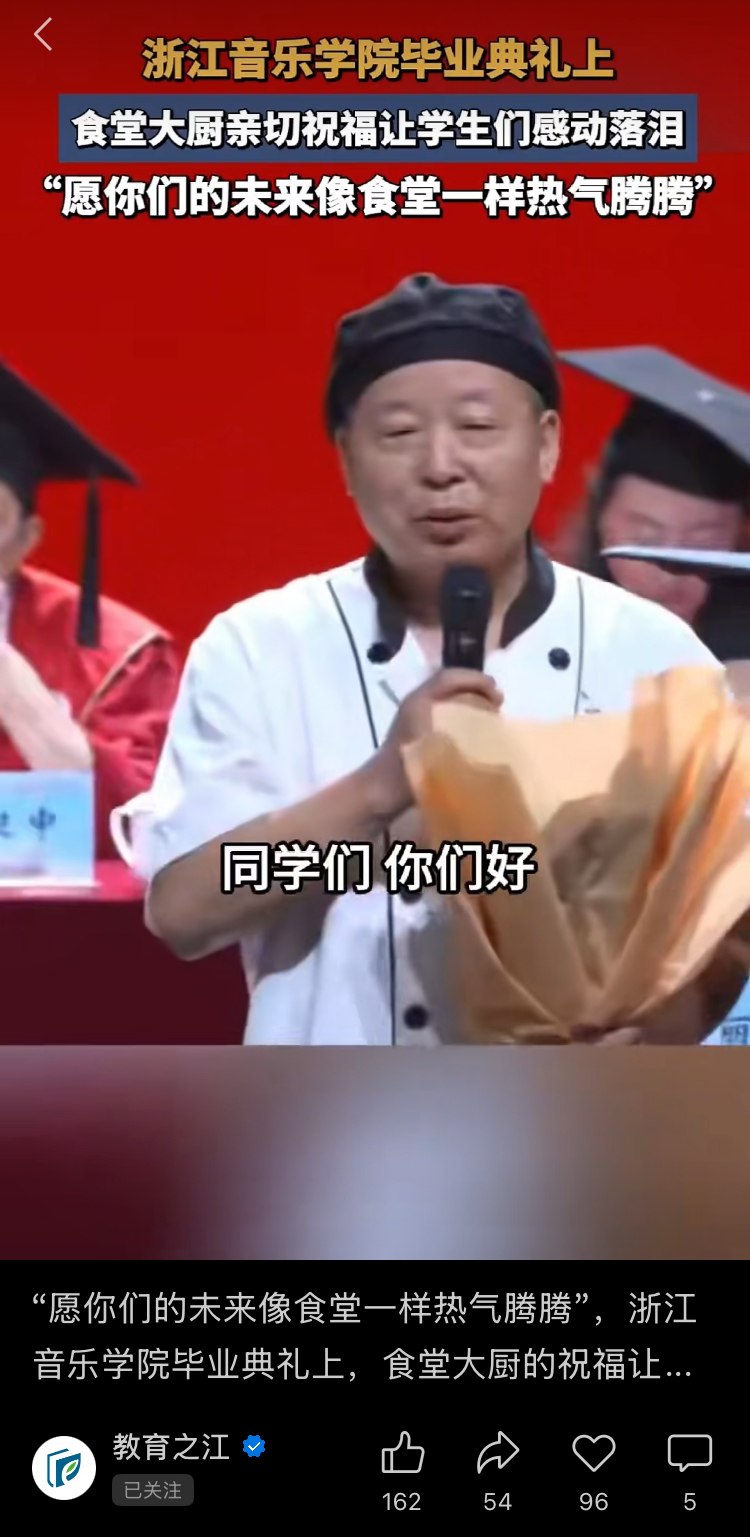 教育之江:“愿你们的未来像食堂一样热气腾腾”,浙江音乐学院毕业典礼上,食堂大厨的祝福让学生感动落泪。#毕业季