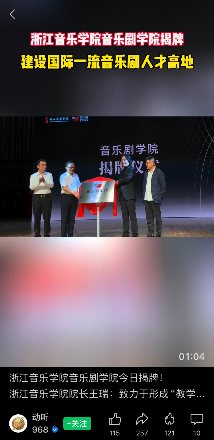 动听968: 浙江音乐学院音乐剧学院今日揭牌! 浙江音乐学院院长王瑞:致力于形成“教学、创作、演出、研究、产业”五位一体的新型发展模式,建设国际一流音乐剧人才高地。#浙江音乐学院 #音乐剧学院