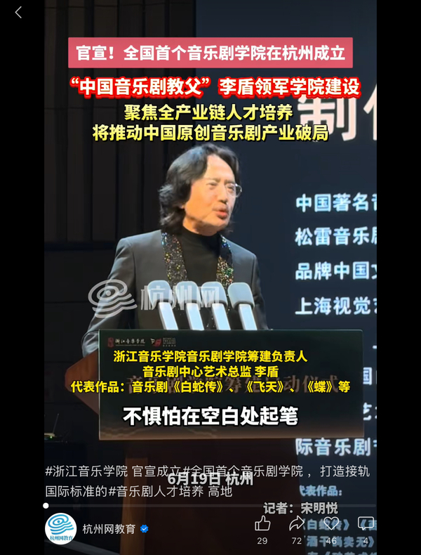 杭州网教育:#浙江音乐学院 官宣成立#全国首个音乐剧学院 ,打造接轨国际标准的#音乐剧人才培养 高地