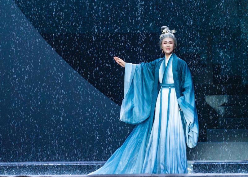 民族歌剧《李清照》不仅是对一位著名历史人物的艺术再现,也是对宋韵文化的一次深入挖掘与展现,除了独特的创作角度,浓浓的宋韵弥漫全剧。该剧主创团队深度挖掘宋韵文化,在舞美、音乐、服饰等维度打造“流动的宋画”。舞美设计裘冰以中央雨幕为核心意象,配合灯光投影的虚实变化,时而化作“梧桐更兼细雨”的江南愁绪,时而变为“不肯过江东”的历史烽烟;服装设计以莫兰迪色系搭配丝绡绸缎,再现宋代极简雅致的审美。