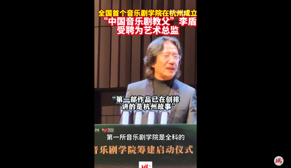 “中国音乐剧教父”李盾受聘为艺术总监。“第一部作品已在创排 ,讲的是杭州故事”。
