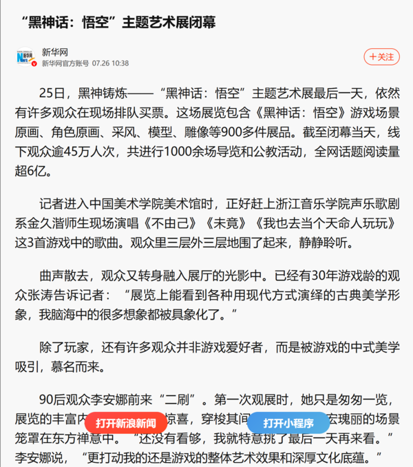 新华网|新浪新闻:“黑神话:悟空”主题艺术展闭幕