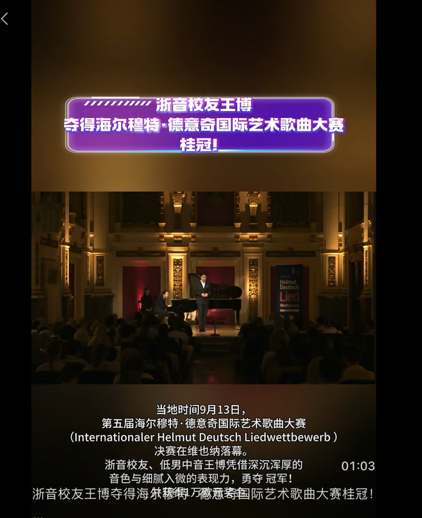 音乐周报:浙音校友王博夺得海尔穆特·德意奇国际艺术歌曲大赛桂冠! 当地时间9月13日,第五届海尔穆特·德意奇国际艺术歌曲大赛(Internationaler Helmut Deutsch Liedwettbewerb )决赛在维也纳落幕。浙音校友、低男中音王博凭借深沉浑厚的音色与细腻入微的表现力,勇夺 冠军!并获得1万欧元奖金。