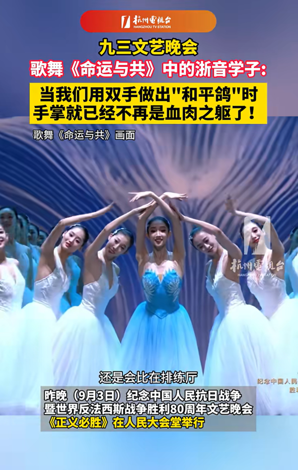 杭州综合频道:#九三 文艺晚会歌舞《命运与共》中的#浙江音乐学院 学子:当我们用双手做出“#和平鸽 ”时,手掌就已经不再是血肉之躯了!
