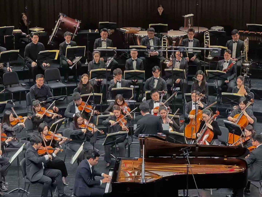在这场高规格的音乐盛宴中,浙音师生积极参与、全情投入。音乐会上半场,钢琴协奏曲《黄河》震撼上演。这部创作于1969年的经典之作,以《黄河大合唱》为蓝本,将民族音乐的魂魄注入钢琴的黑白键之中。浙音青年钢琴演奏家吴君麟,与11所音乐学院优秀青年演奏家组成的联合乐团默契配合,在中国音乐学院教授、指挥系主任金野的执棒下,以极具张力的演奏将黄河的怒吼与民族的呐喊交织在一起,迸发出排山倒海的力量,奏响了中华民族不屈不挠的壮丽史诗。