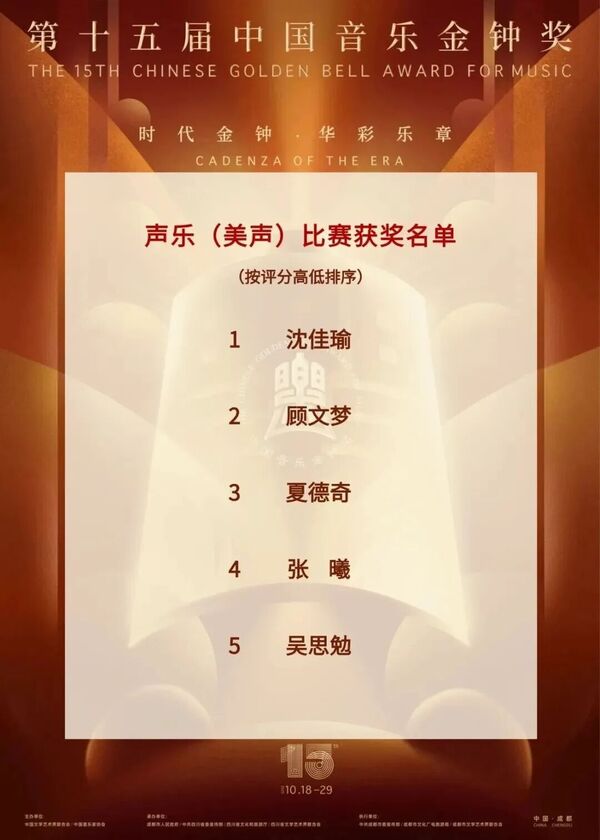 10月26日晚,第十五届中国音乐金钟奖声乐(美声)比赛决赛圆满结束,5名选手最终脱颖而出敲响“金钟”,其中,由浙江推荐选送的青年歌唱家沈佳瑜,以总分第一名的成绩获奖。