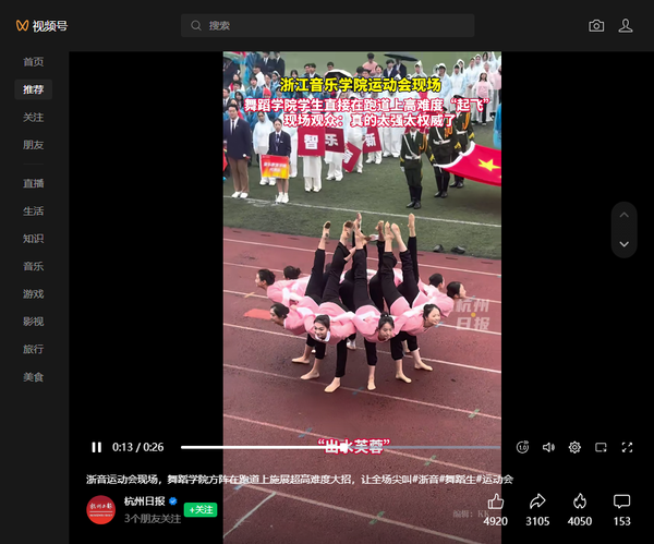 杭州日报:浙江音乐学院运动会现场 舞蹈学院方阵在跑道上施展超高难度大招,让全场尖叫