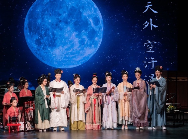 演出在浙江音乐学院作曲教师蒋骁然编创的《木兰花慢》中达到高潮,全体演员共同演绎辛弃疾的中秋问月词,在“是天外空汗漫,但长风浩浩送中秋”的磅礴气势中慷慨高歌。