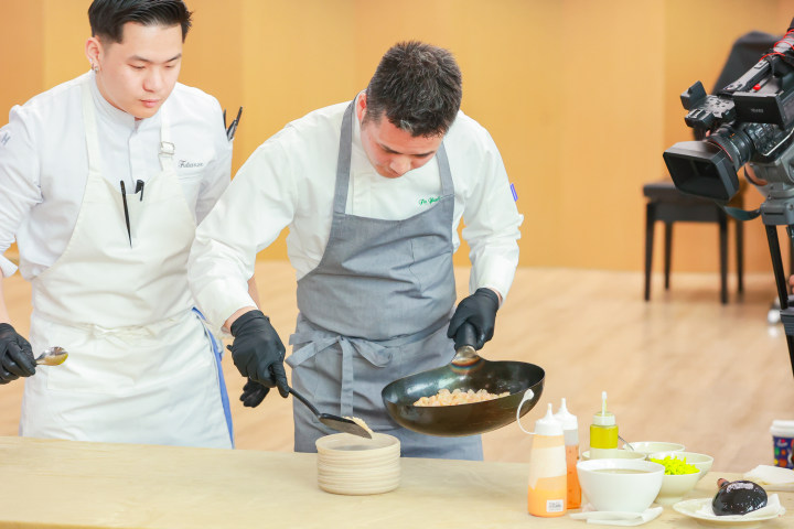傅月良大师现场制作餐厅招牌菜——第50多版的龙井虾仁和百花酿虾胶,还分享了坚持传承创新杭帮菜的的心路历程,讲解菜肴背后的文化故事。