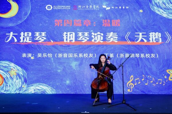 第一篇章“微光”,寓意每个孩子都是夜空中独特的星辰。浙音钢琴系2020届校友、美国俄亥俄州立大学钢琴博士丁革以一曲《月光》独奏开启温情序幕,用轻柔琴声营造温馨氛围;由浙大儿院医务人员组成的“小狮子合唱团”深情演绎《星辰大海》,医者仁心与艺术之美在此刻交融。第二篇章“同行”,诠释医校携手的初心使命。浙音流行音乐系2025届校友、音乐人林敬然带来原创治愈歌曲《逐光》,传递阳光般的温暖与鼓励;浙音管弦系2021届校友谷川与管弦系师生联袂呈现弦乐四重奏《四季·春》,展现生机勃勃的盎然春意与希望图景。第三篇章“生长”,寄托突破自我、向阳而生的期许。3位孤独症儿童勇敢登台,通过吉他、钢琴弹唱及小合唱《静止》《我的未来不是梦》,用清澈嗓音诉说内心渴望,展现了成长的无限可能,令全场为之动容。第四篇章“温暖”,象征爱意与真情陪伴成长之路。浙音国乐系2025届校友吴乐怡和钢琴系校友丁革携手,带来大提琴与钢琴合奏《天鹅》,舒缓温柔的旋律充满了治愈力量。