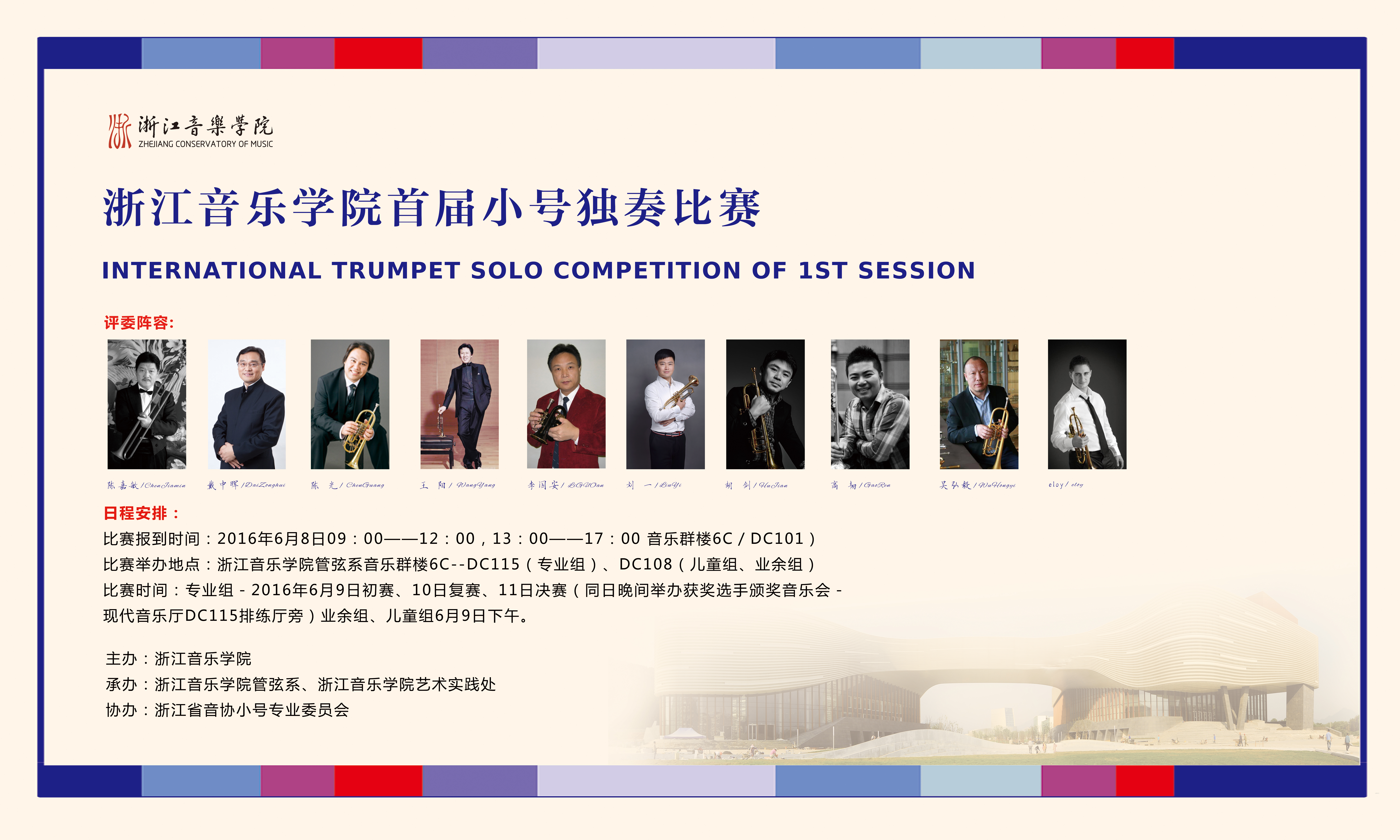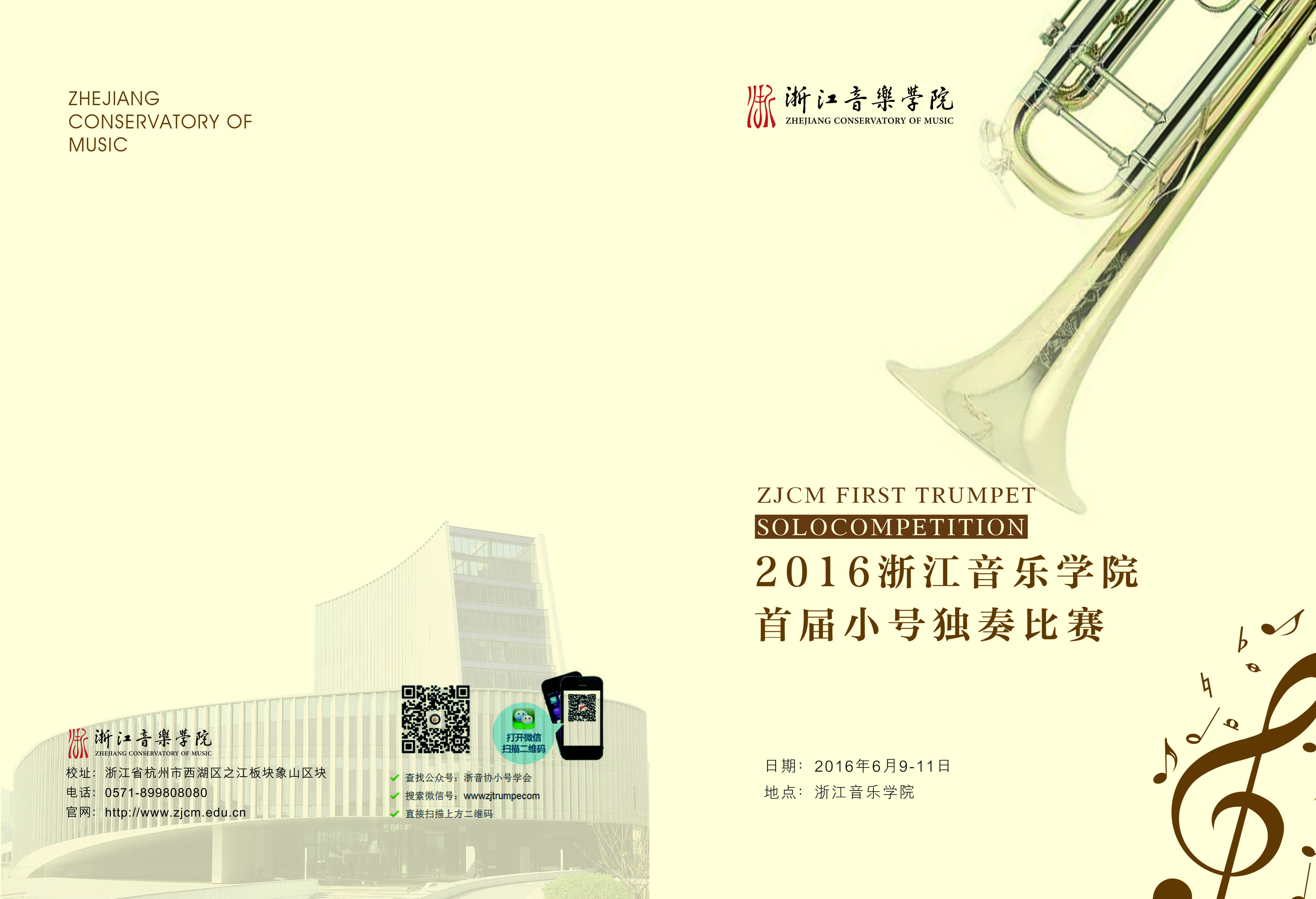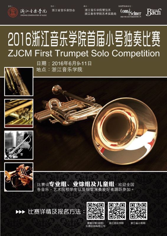 1.为促进和提高中国管乐演奏及室内乐演奏和教学,发现和培养优秀人才,繁荣中国管乐演奏和音乐创作,由浙江音乐学院主办、浙江省音乐家协会、小号专业委员会协办,浙江音乐学院管弦系承办的“首届浙江音乐学院小号独奏比赛”将于2016年6月9-11日在浙江音乐学院举行。