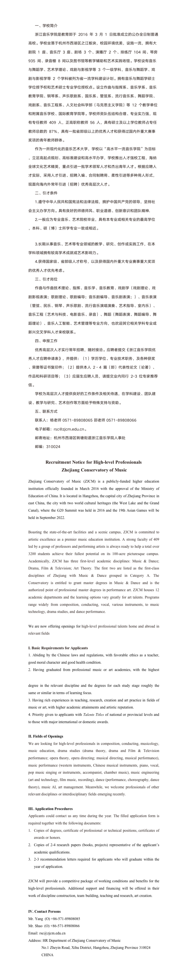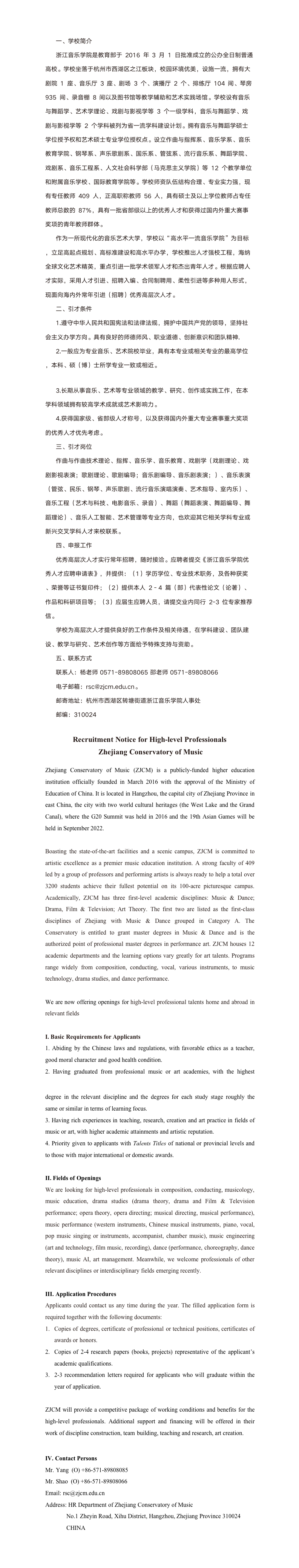 浙江音乐学院常年引进(招聘)海内外优秀高层次人才公告