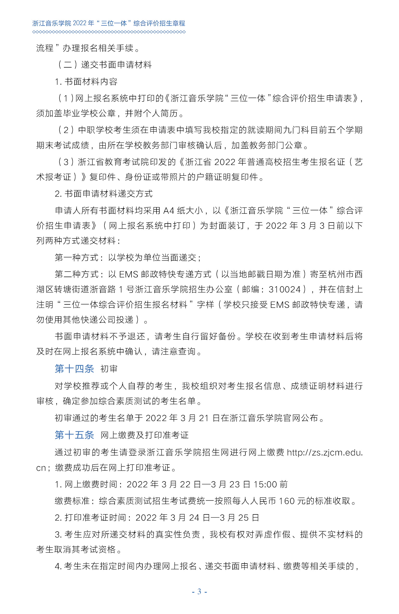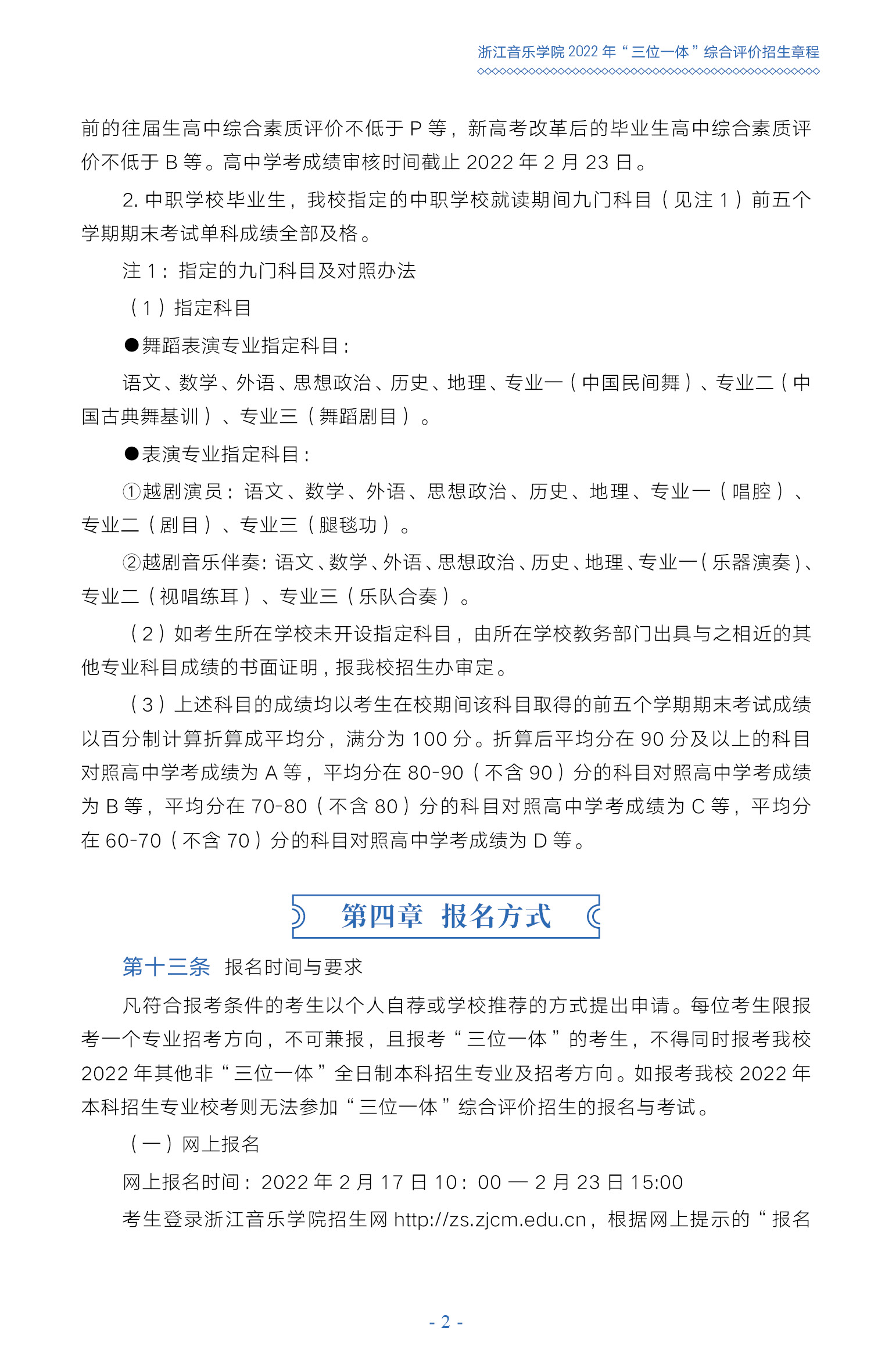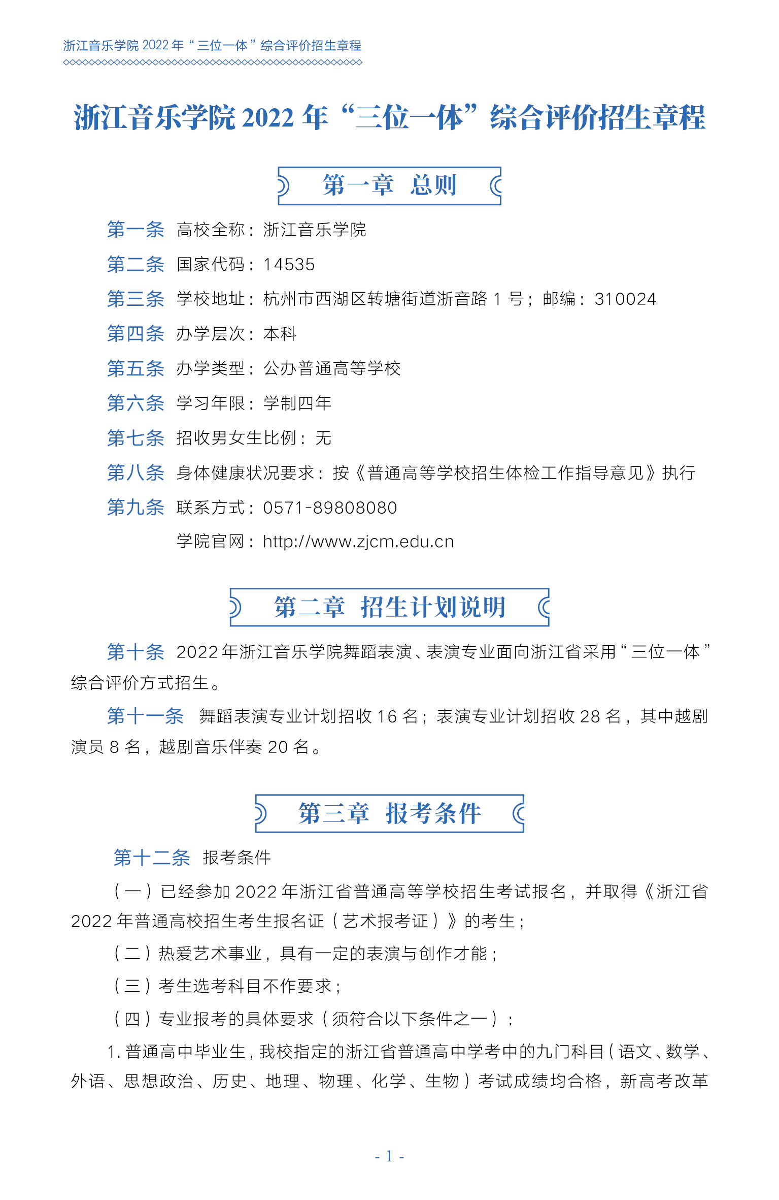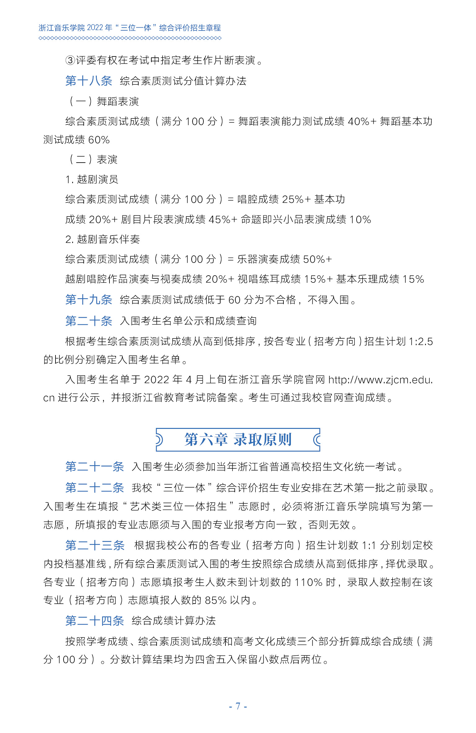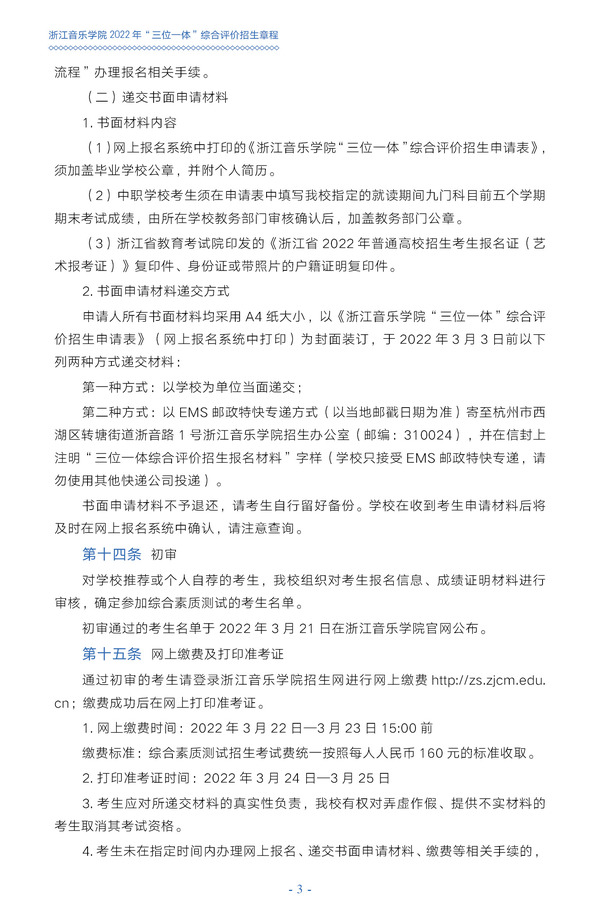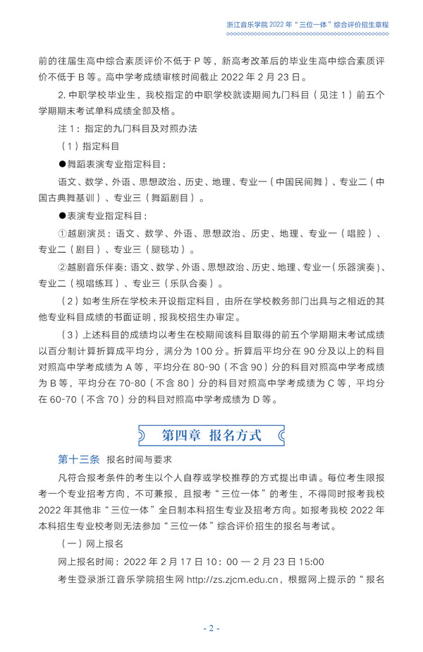 浙江音乐学院2022年“三位一体”综合评价招生章程