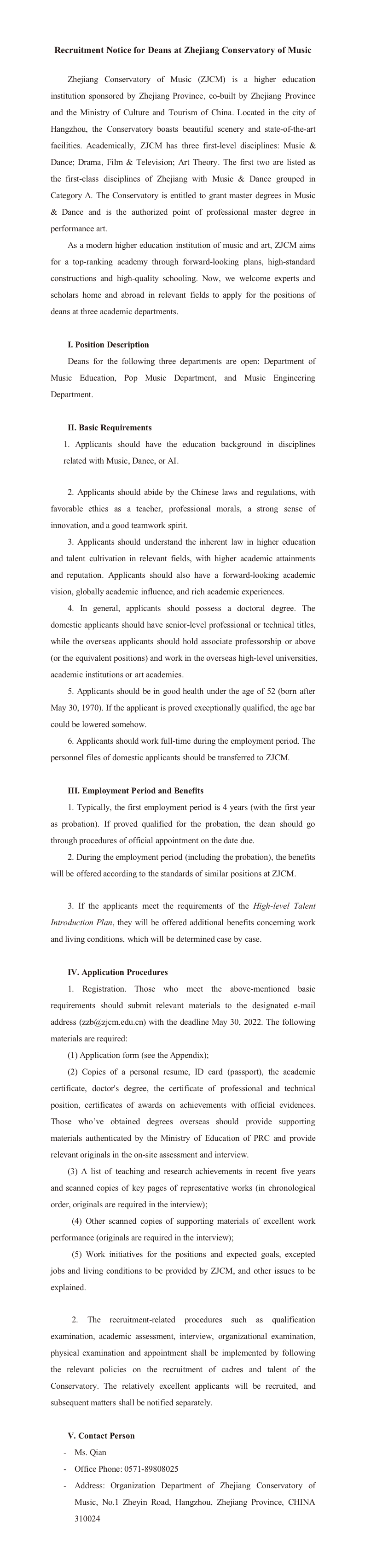 浙江音乐学院公开招聘二级学院(系)院长、主任公告