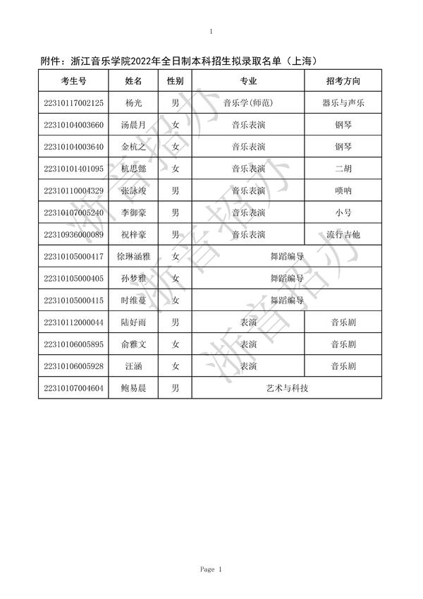 浙江音乐学院2022年全日制本科招生拟录取名单(上海市)