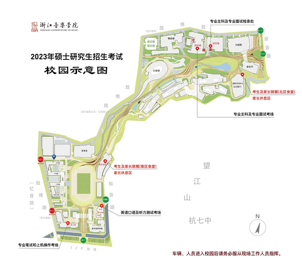 5.如需自驾车辆进入考点,请听从指挥,将车辆停放地下车库,临时接送车辆即停即走;学校周边交通路况复杂,请考生及时了解杭州市区车辆限行规定,选择合适的交通工具提前出行,以免误考。考试当天6:30后考生、家长方可进入校园。在综艺楼(附中楼)参加考试的考生,建议从浙音路东1门(行车道)或东大门(人行道)进入校园;在南区综合教学楼15A、15B参加考试的考生,请从南门进入校园。如乘坐地铁6号线到浙江音乐学院站,可从320国道“浙江音乐学院南门”进入校园。