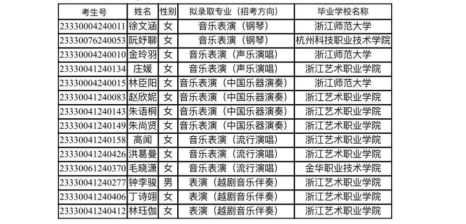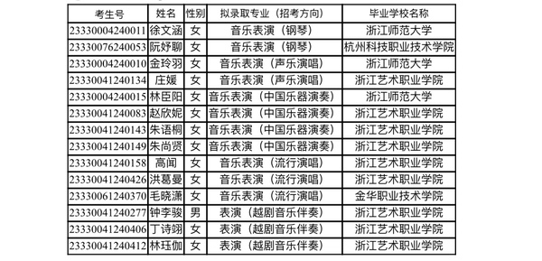 附表2:浙江音乐学院2023年“专升本”拟录取名单