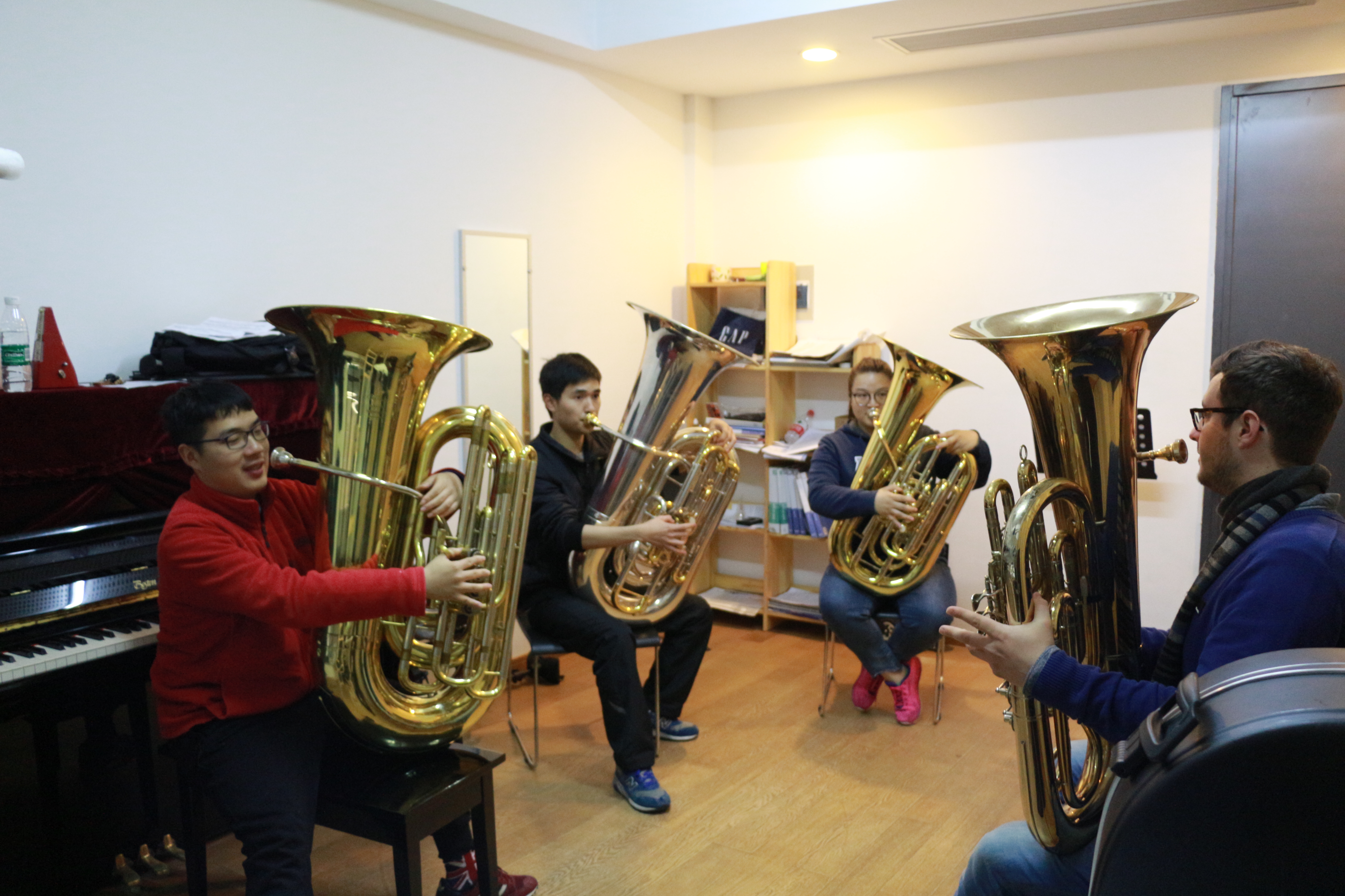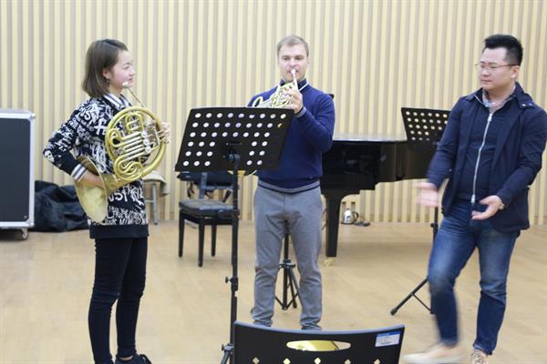 大师课上,圆号、长号、大号和两位小号大师们分别在五个不同的教室为师生授课。来自莱比锡格万特豪斯管弦乐团的首席小号手卢卡斯·贝诺主讲铜管五重奏,他细致地讲解、亲身示范,悉心指导两组铜管五重奏学生们在五重奏中如何校音,如何配合,并为师生们上了乐队片段课,让师生们欣赏了在国内很少有机会接触到的纯正的德国风格乐队片段演绎和教学。来自古斯塔夫马勒青年管弦乐队和莫扎特乐团的成员乔纳森·米勒为师生们上了一堂独奏曲和一部分乐队片段的欣赏课,他通过灵活运用气息带出乐曲不同的感情色彩,让学生们深刻理解了铜管乐器演奏中气息使用的重要,还专门为两组铜管五重奏学生们授课,教授他们如何做基本练习,如何培养五重奏之间的默契,如何在乐曲中相互承接,让音乐更加得流畅等专业技艺。圆号、长号和大号的三位大师简·温斯勒、托拜厄斯·哈塞尔特、托比亚斯·瑞尼卡分别为师生们上了独奏大师课,他们带领学生练习基本功,细心教授学生如何细致地处理音乐,并对学生们演奏中的缺点和不足予以悉心指导。他们生动活泼的讲解和高湛的技艺示范深受学生们的喜爱,课堂上气氛活跃、笑声不断。