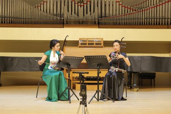 项目培训期间,还举行了“民族室内乐青年演奏人才培养”项目结项汇报音乐会。该音乐会分为两个系列进行,系列一音乐会参演团队主要为项目学员在本单位所指导的学生组合。由何娜指导的“江南忆”胡琴四重奏组合受邀精彩亮相,首演了由何娜作曲的胡琴四重奏《胡中越影》。该组合曾入选文化部主办的第六届全国青少年民族乐器教育教学成果展示活动(原文华院校奖)。系列二音乐会为项目学员的学习汇报音乐会,由何娜担任导聆并与武汉音乐学院的二胡教师姚可馨共同演绎了江南丝竹八大曲之一《慢三六》。