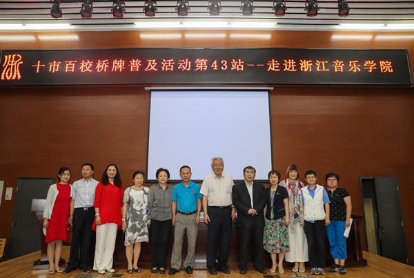 5月24日下午,由中国桥牌协会主办的“十市百校桥牌普及活动”首次走进全国艺术类高校,来浙音传播桥牌文化。中国桥牌协会特约顾问、原中国桥牌协会副主席俞晓松,浙江省新闻出版广电局(版权局)局长、浙江省桥牌协会主席、中国桥牌推广大使寿剑刚,围棋世界冠军、棋圣聂卫平,中国桥牌协会副秘书长周敏、李国华,学院党委副书记贾秀英,桥牌世界冠军古玲、朱小音出席。启动仪式由公共基础部副书记肖丽琴主持。