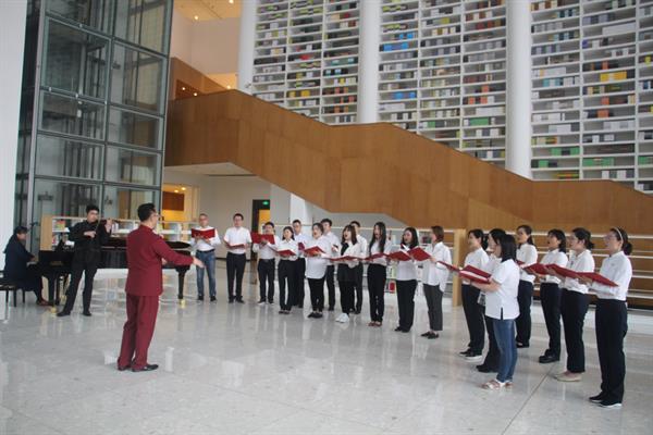 4月23日是第24个世界读书日,学院机关党总支“书香”合唱团在图书馆大厅发布了以“书香机关”为主题的歌曲《书香里》(合唱版),受到了广大师生的欢迎。合唱《书香里》由我院吴涤老师词曲创作,并编曲指挥,单琲老师担任小提琴伴奏,李琦老师担任钢琴伴奏,“书香”合唱团由机关各支部党员和入党积极分子组成。