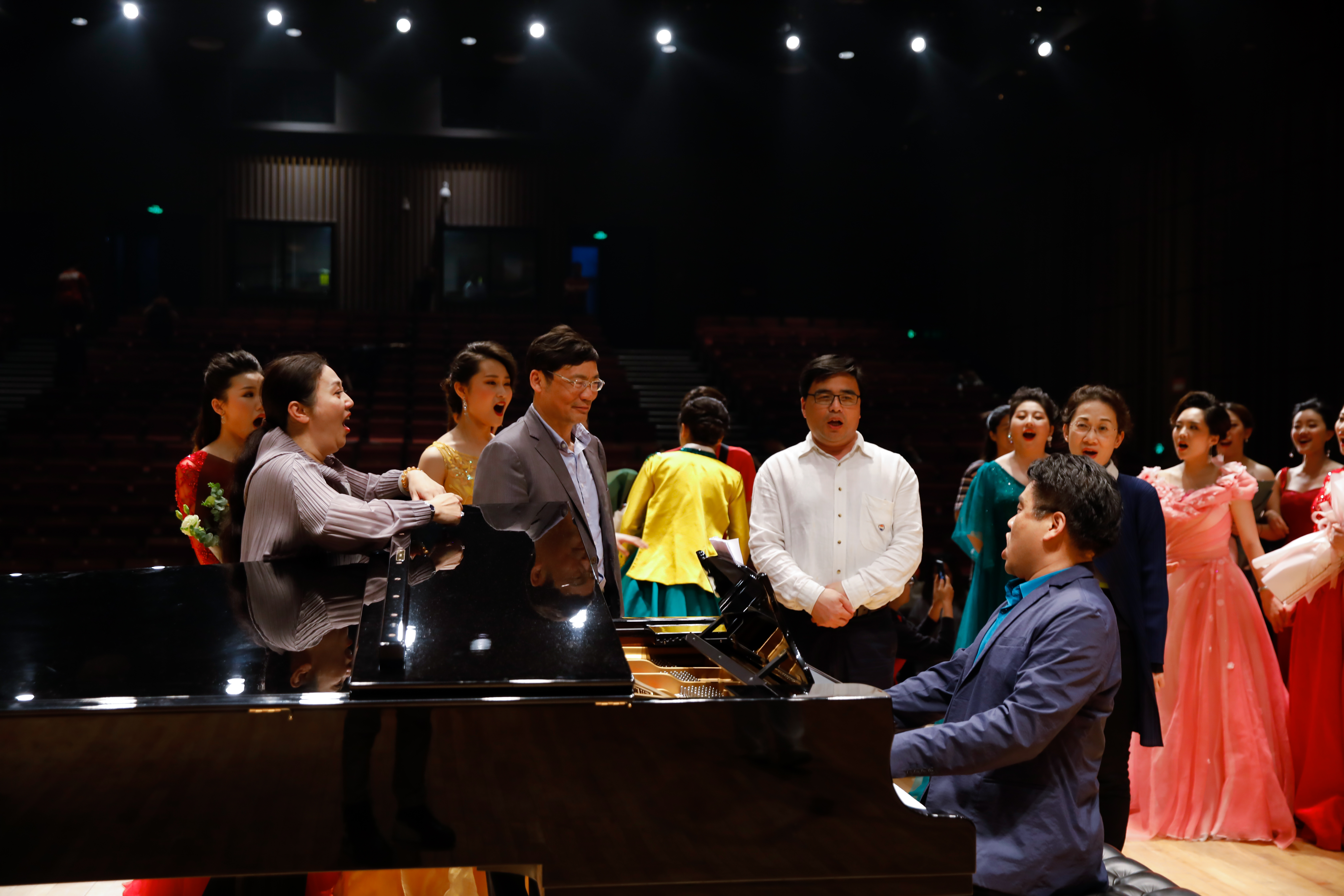 音乐会结束后,学院领导上台与全体师生合影留念。最后,在胡建新的提议下,由王维平钢琴伴奏,胡建新和方培新带头领唱,和大家一起再次高唱《我和我的祖国》,将音乐会画上圆满句号。