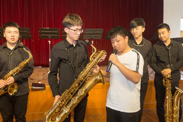 音乐会上,乐队总监娄洋老师以音乐导聆的身份,向同学们普及了萨克斯管的专业知识,并让四个不同声部的乐队成员吹奏自己手中的乐器,方便现场的同学听辨他们声音的不同。娄洋还邀请同学们上台用手触摸四支乐器,讲述它们的形状。同学们聚精会神的聆听,并积极参与互动。音乐会在一首惬意的开场曲《绚丽的咖啡馆》正式拉开帷幕,古典风格的《小夜曲》、动漫风格的《久石让曲集》、星球大战插曲《酒吧的乐队》、南美洲拉丁风格的《拉丁旋律曲集》,还有《瑶族舞曲》《鞑靼舞曲》《天堂电影院》《帕特里克先生》等耳熟能详的曲目,让同学们听得如痴如醉、掌声雷动。