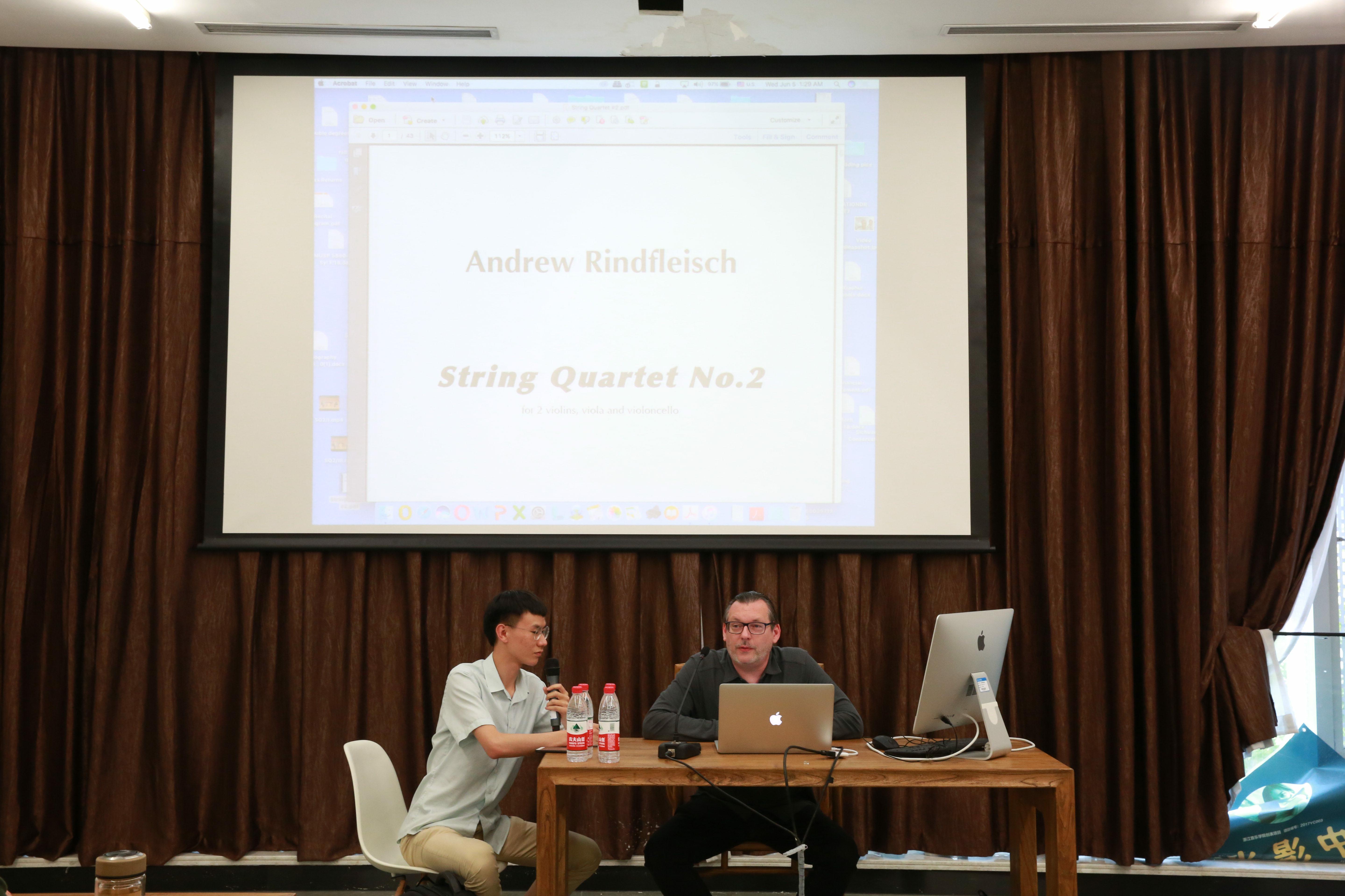 瑞德傅莱士在讲座中介绍了他于2013年创作的第二弦乐四重奏《String Quartet No.2——for 2 violins, viola and violoncello》。该作品分为四个乐章,各乐章之间存在鲜明的对比,频繁使用了第一小提琴A弦调高1/4音、第二小提琴D弦调低1/4音等特殊调弦。瑞德傅莱士还介绍了作品间弱音器的用途。最后,他以自己的一部双调性混声四部合唱《Extinguish Thou My Eyes》结束讲座。