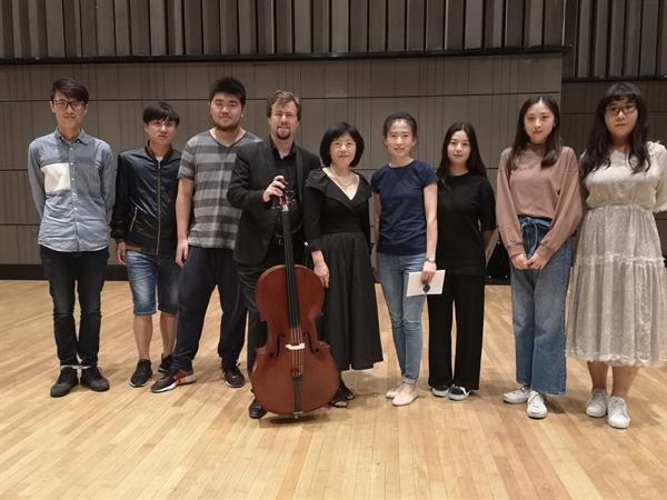 24日上午,Jonathan Pesek应邀在管弦系举办了大师班,指导三位同学演奏了巴赫的无伴奏《第三组曲》和《第四组曲》。Jonathan Pesek教授针对学生的不同问题进行了指导,为学生们示范了指法,着重强调了右手的力量和音质的控制方法,使同学们的声音得到了很大的改善。授課中,同学们对Jonathan Pesek教授严谨细腻的音乐态度感叹不已。