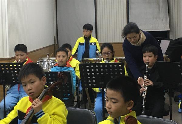 在胜利小学,党员教师们对乐团小团员们开展了认真的演奏指导。他们有的为小团员调整琴弦、校对音准,有的为小团员安装哨片、维修乐器,并分声部开展了现场教学,并耐心地为小团员们演奏示范。在乐团合排之前,教师们又指导小团员们分弦乐、管乐打击乐两大声部合奏训练,最后当指挥合排时,小团员们演奏的肖斯塔科维奇的《Jazz Suite No.2》在音准与声部平衡方面均获得了较大改观。