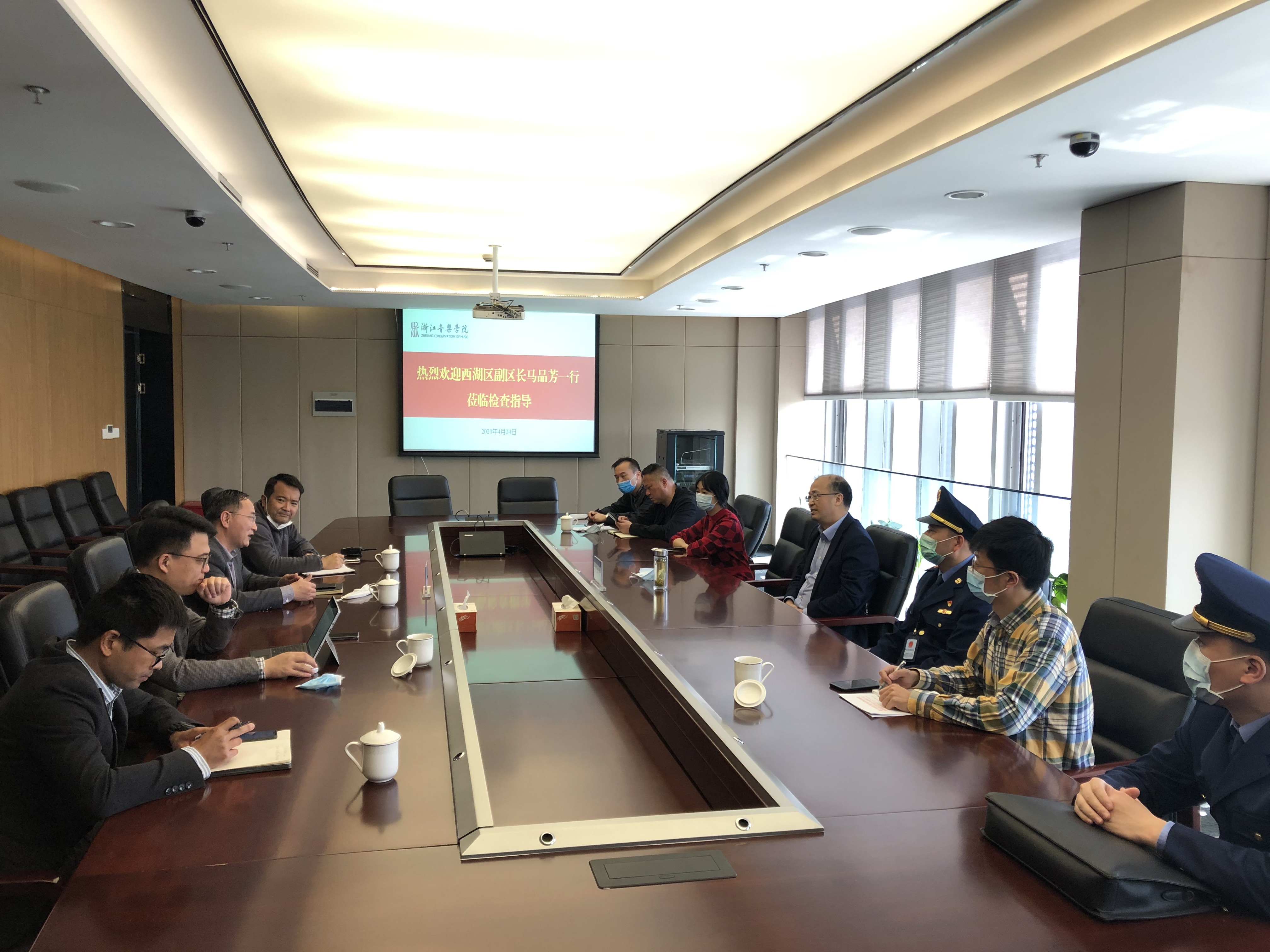 4月24日,西湖区副区长马品芳等一行来院指导疫情防控和开学准备工作。学院副院长张伟波,乐典公司、保卫处等部门负责人陪同调研。